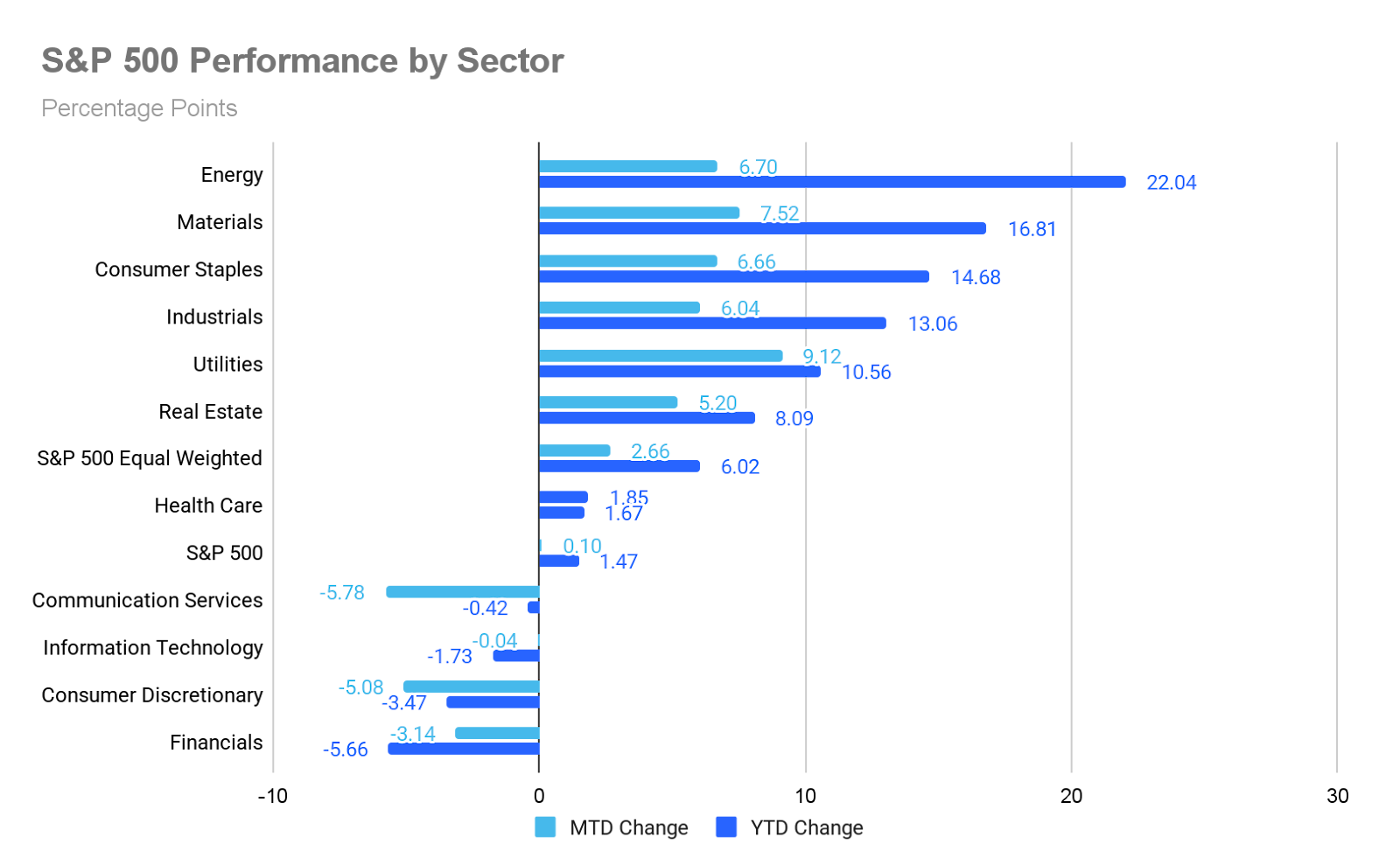 The S&P 500 Utilities sector is the top performer thus far in February at +9.12% MTD and +10.56% YTD, while Communication Services underperformed -5.78% MTD and -0.42% YTD.