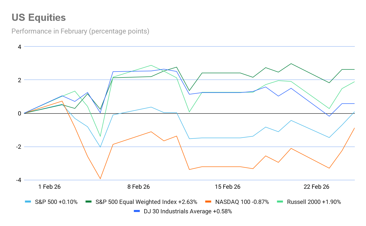 February has seen US equity markets reacting to fears of AI-driven disruption. Major US indices have shown a month-to-date (MTD) performance: S&P 500 +0.10%%, Nasdaq 100 -0.87%, Dow Jones +0.58%%, and Russell 2000 +1.90%.