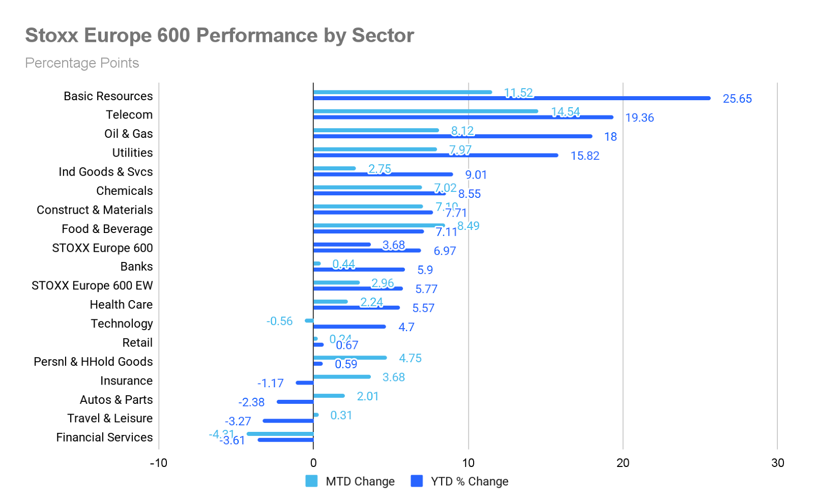 The Stoxx 600 Telecommunications is the leading sector, +14.54% MTD, and +19.36% YTD, while Financial Services exhibited the weakest performance at -4.31% MTD and -3.61% YTD.