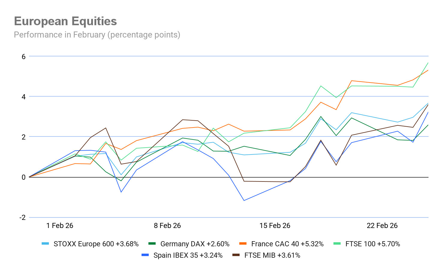 Industrial Goods & Services traded higher, particularly in the staffing segment, as Adecco Group rose following solid Q4 results, reflecting resilient demand and margin improvement across services. In contrast, Food & Beverages was the primary underperformer, with Diageo declining sharply after cutting its sales and dividend guidance. Edenred also fell after a Brazilian court reinstated changes to the meal-voucher system.