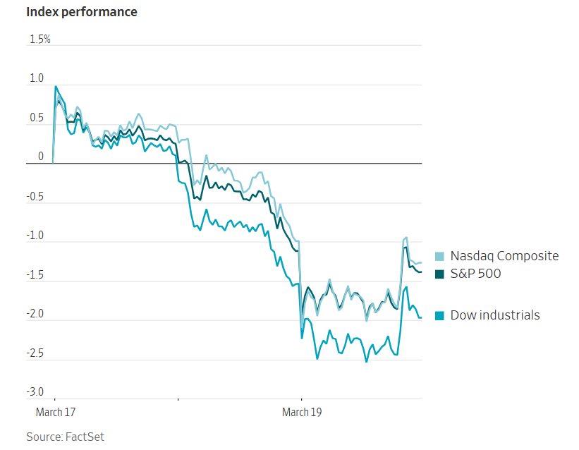 Indexes opened lower and pared losses later in the day. The Dow Jones Industrial Average fell by -0.44%, or 203.72 points, while the Nasdaq Composite and S&P 500 declined by -0.28% and -0.27%, respectively. The Dow now stands approximately 8% below its record high reached in February.